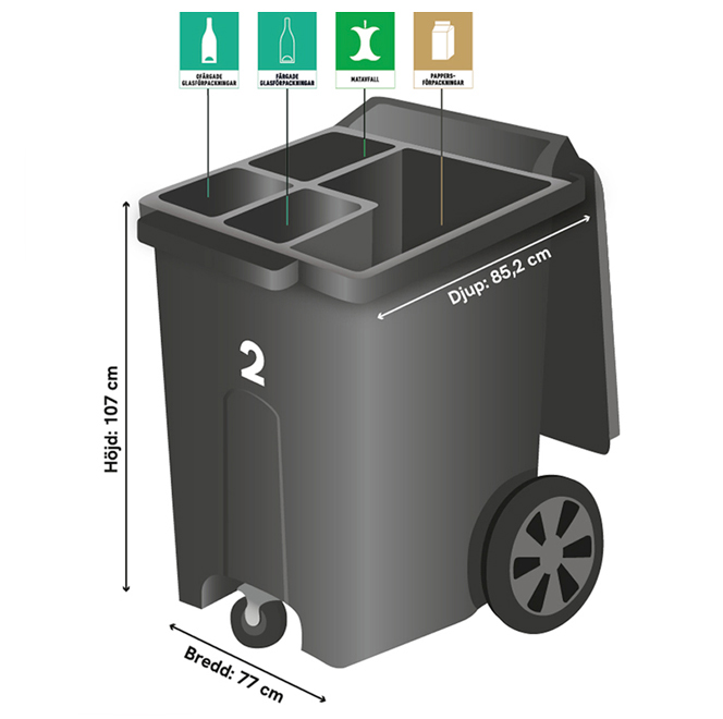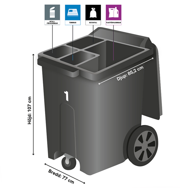 Varje fastighet får två fyrfackskärl med plats för totalt åtta avfallsslag. Du sorterar alltså alla förpackningar där du bor. Enklare för dig – bra för miljön.